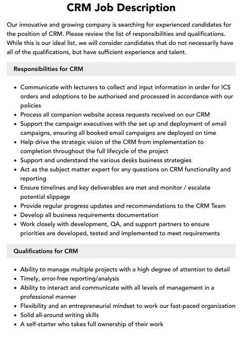 A CRM job description is a vital tool for attracting and hiring top talent in the field of customer relationship management. It outlines the key responsibilities, qualifications, and expectations for the role, providing a clear understanding of the position’s purpose and impact within the organization.